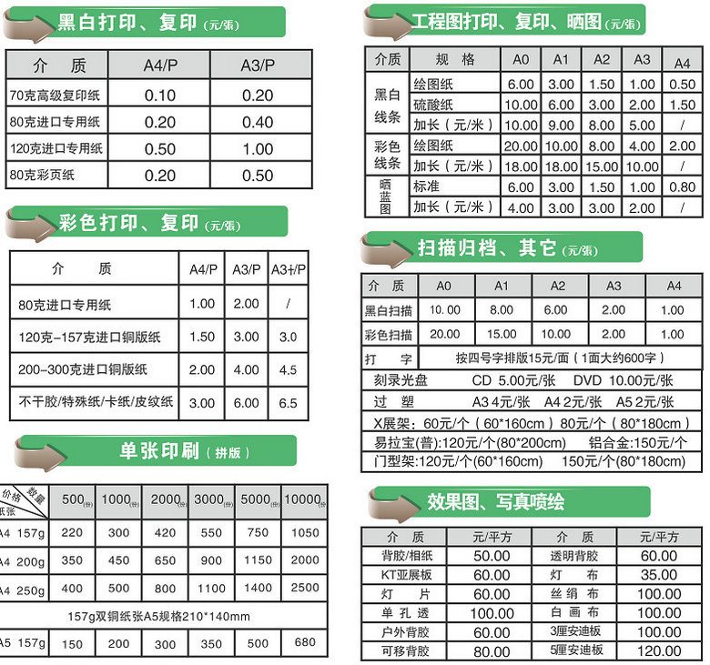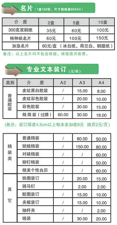 備注:以上單張(zhāng)印刷報價均爲(wei)拼版,壓線折頁(ye)加收0.1元/張,A3按本(běn)價格2倍。